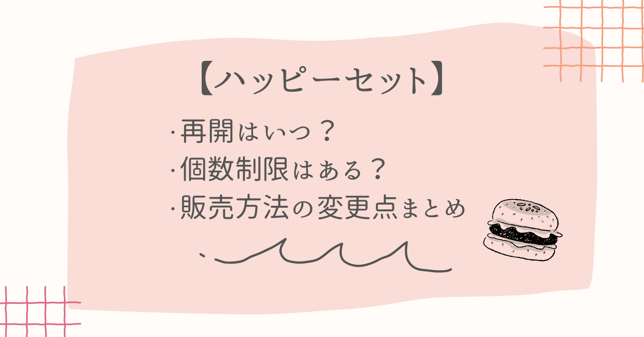 マクドナルドの人気メニュー「ハッピーセット」。 再開を心待ちにしている方も多いのではないでしょうか。 について詳しくまとめています。 ハッピーセットを楽しみにしている方は参考にしてみてくださいね。 リ ...
