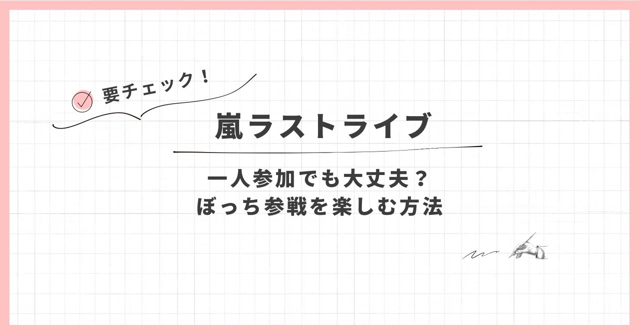 嵐のライブに一人で参加することになって、 「一人参加でも大丈夫?」「周りは友達同士ばかり?」と不安に感じていませんか? 今回のラストライブは既存のファンクラブ会員限定ということもあり、 実は一人で申し ...