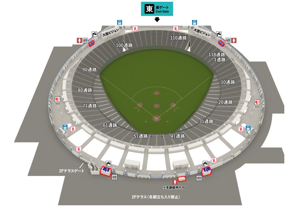 - 着席指定席はスタンド前方席や4階スイートシートになる例がある